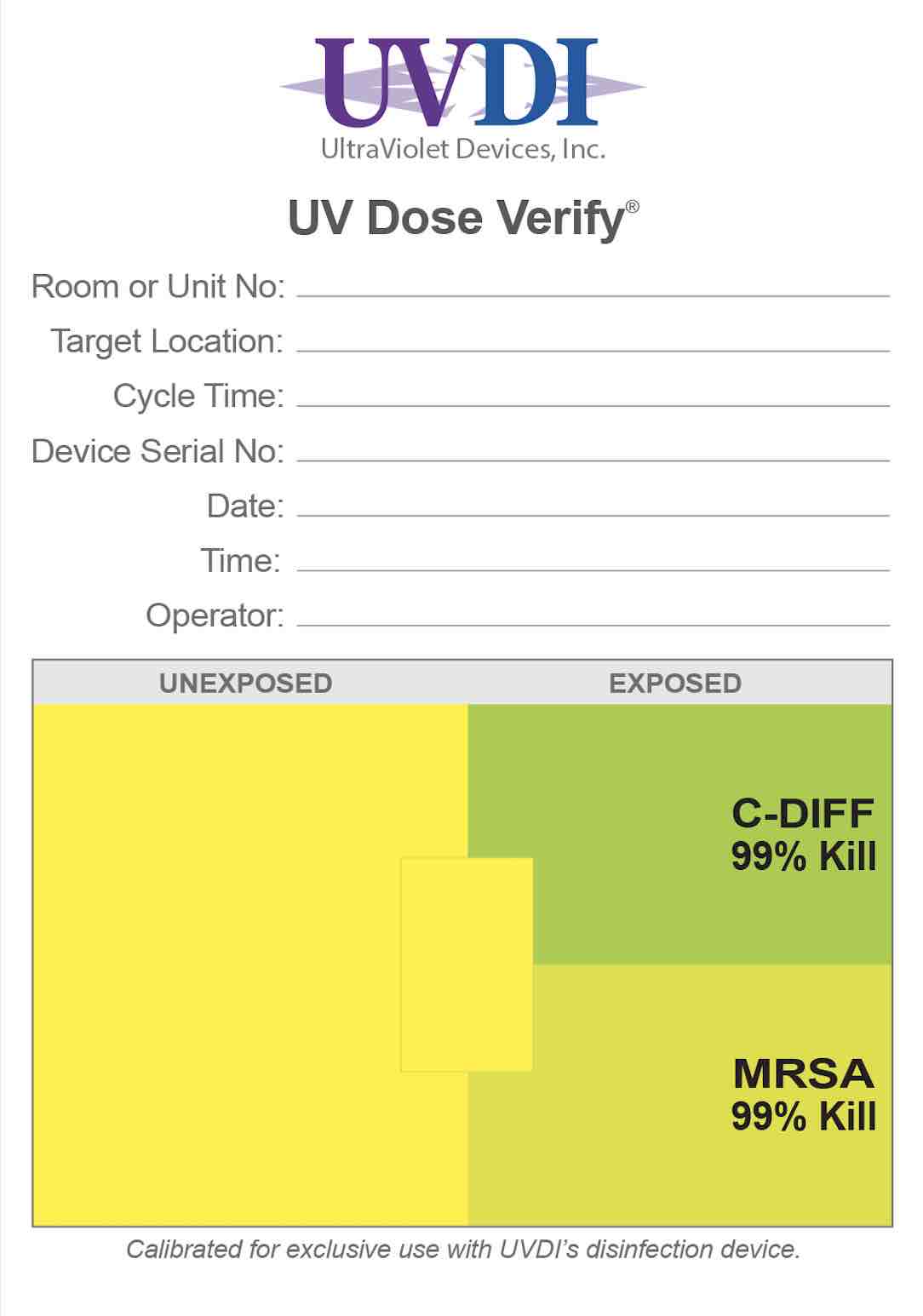 UV-C sensitive rectangle located in the center of the card changes color when exposed to UV-C energy. The color change is calibrated to specific germicidal dose levels.